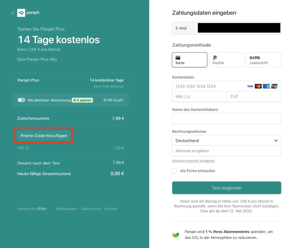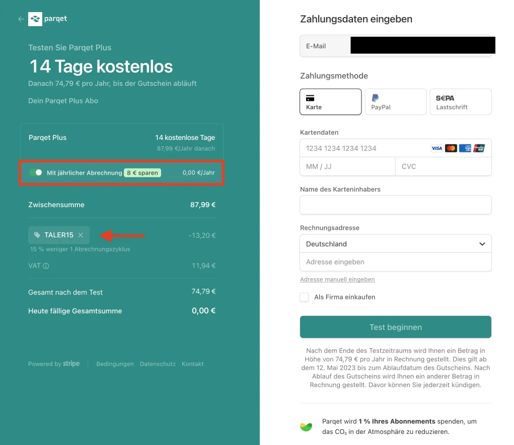 Schritt 3: Mit dem automatischen Parqet Promocode werden 10% vom Abopreis abgezogen. Weitere 32€ kannst du dauerhaft sparen, wenn du dein Parqet-Abo jährlich statt monatlich bezahlst.