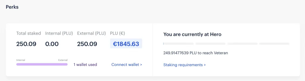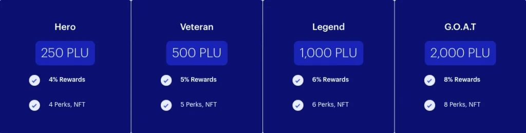 Wer den PLU Token kauft oder über das Cashback sammelt, steigt im Treuelevel auf. Zum Start bekommt man 3% Cashback ohne PLU Token. Für das nächste Level „Hero“ musst du mindestens 250 PLU besitzen. Danach verdoppelt sich die Anzahl zum nächsten Level jeweils.