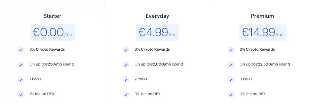 - kostenlose Kreditkarte mit 3 % Cashback + 1 Perk ohne Verpflichtungen (z.B. Staking)