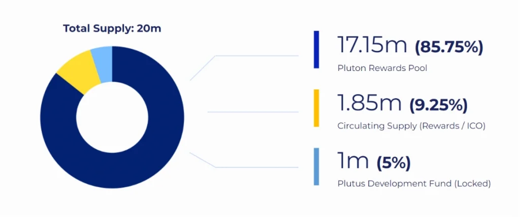 Die maximal Menge an Token wurde auf 20 Mio. PLU festgesetzt. Davon befinden sich ~ 2 Mio. Token (~10 %) aktuell im Umlauf und 1 Mio. PLU Token (5 %) befinden sich im Development Fund, wovon die Hälfte im September 2022 freigegeben wird. Die restlichen ~17 Mio. PLU (~85 %) sind für die zukünftigen Cashback Rewards.