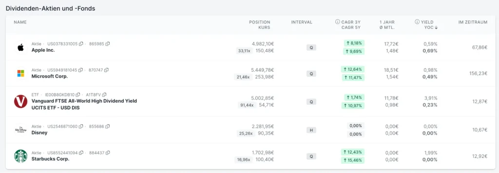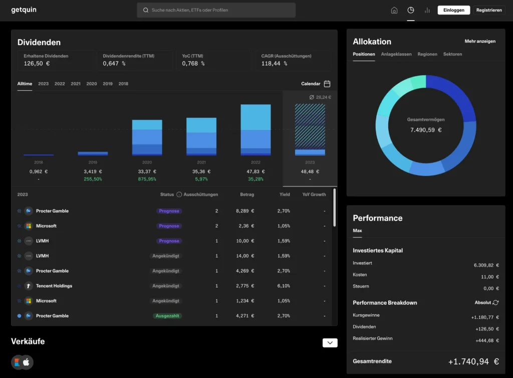 - Zukünftige Dividenden, Zinsen und andere Cashflows sehen in der jeweiligen Portfolio Performance App einsehen.