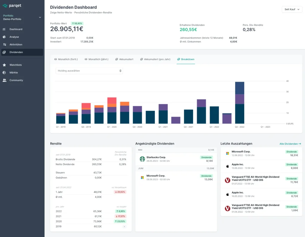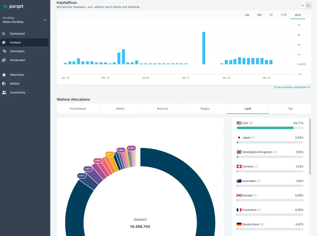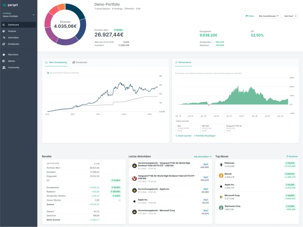 Parqet (ehemals Tresor One) ist eine sichere und vertrauenswürdige Möglichkeit, das eigene Portfolio zu verfolgen und bietet umfangreiche Analysefunktionen, um den Anlageerfolg zu verbessern.