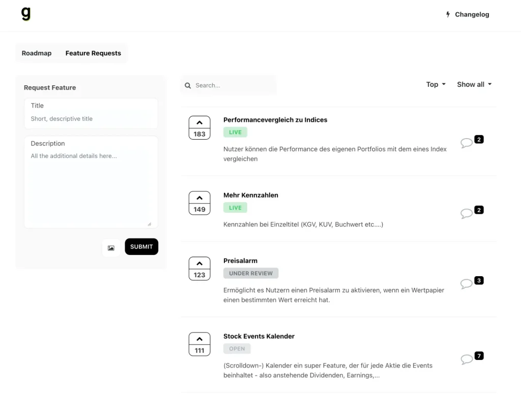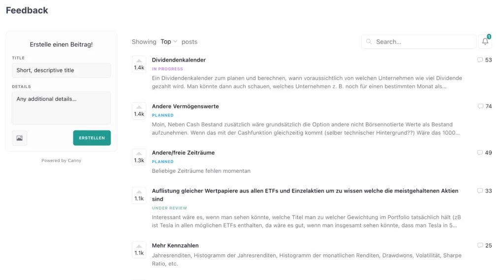 Bei Problemen bietet getquin zahlreiche Kontaktmöglichkeiten, um den Support zu erreichen. Dies kann per Mail, Chatbot oder direkt über die “Twitter”-Funktion der Plattform geschehen. Außerdem bietet getquin, ähnlich wie Parqet, ein Voting-System an, um über zukünftige Funktionen abstimmen zu können.
