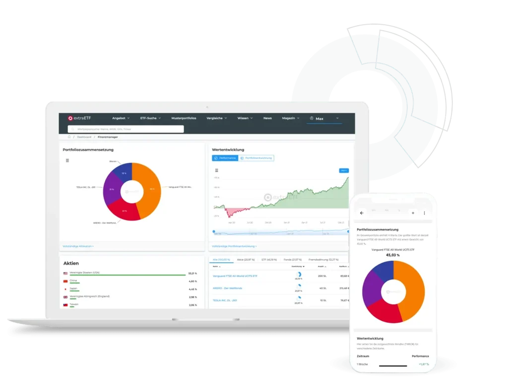 Als umfassende ETF-Suchmaschine hat sich extraETF bereits einen Namen gemacht. Zusätzlich bietet extraETF seit einiger Zeit mit dem Finanzmanager auch ein Portfolio-Tracking-Tool an, mit dem man sein Vermögen einfach im Blick behalten kann. Der Umfang ist vergleichbar mit den bereits vorgestellten Tools von parqet und getquin.