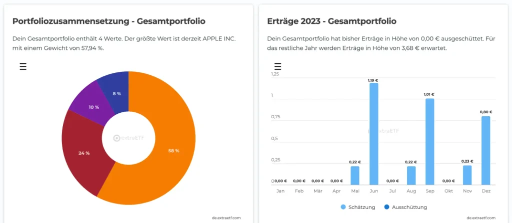 Die Stärke des extraETF Analyse Tool liegt in der Aufbereitung der ETF-Daten in deinem Portfolio. Hier merkt man schnell die Erfahrung als ETF-Suchmaschine und die umfangreiche Datenbank, auf die zurückgegriffen werden kann. Aber auch Aktien können problemlos eingepflegt werden. Der Fokus liegt insgesamt aber klar auf Wertpapieren. Andere Assetklassen wie Krypto, Immobilien und Co. sind zwar teils auch möglich, jedoch fehlen hier oftmals passende Daten.