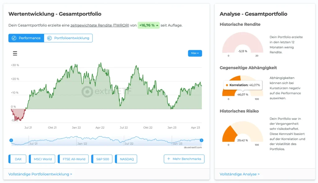 - Zusätzliche Analysefunktion zum Vergleich mehrerer Portfolios oder mit einzelnen Benchmarks wie Aktien und ETFs