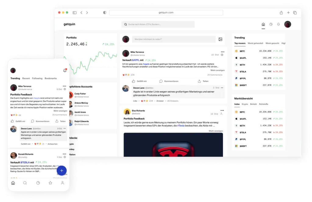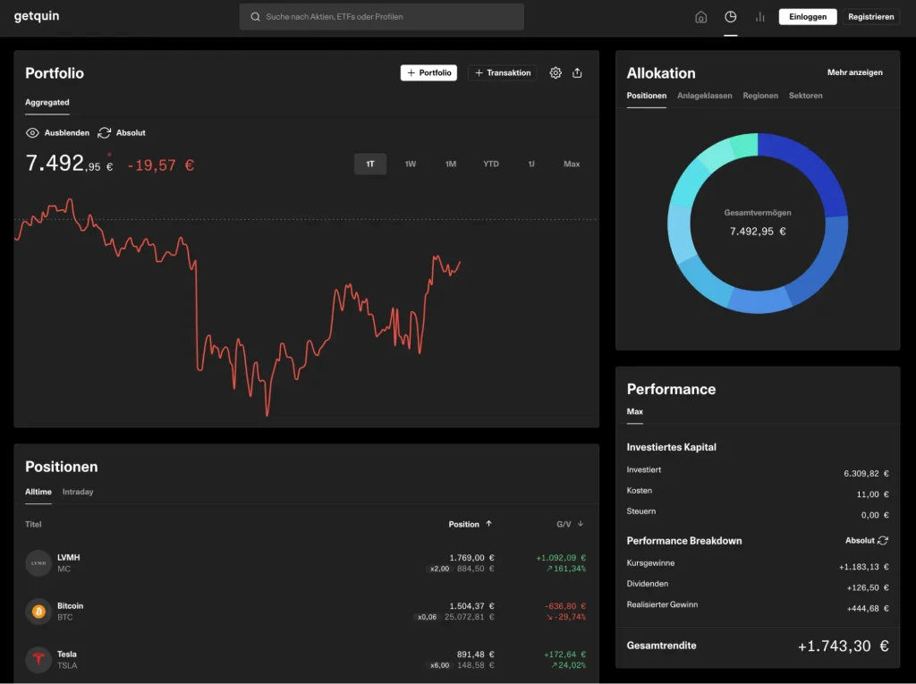 - getquin*: Der Portfolio Tracker von getquin ist für alle interessant, die Wert auf den Austausch mit gleichgesinnten Anlegern legen. Denn bei getquin steht die Community-Funktion klar im Vordergrund. Durch die einfache Möglichkeit, Trades, Portfolios und Watchlisten zu teilen, kann man sich schnell Feedback einholen oder auf die Investments anderer reagieren. Aber auch als Portfolio Tracker macht getquin unserer Erfahrung nach wenig falsch, auch wenn der Analyseumfang noch etwas hinter parqet zurückbleibt. Ein großer Bonus von getquin ist sicherlich auch, dass die Nutzung im Gegenzug für die Einblendung von etwas Werbung noch kostenlos ist. Wie lange das so bleibt, ist allerdings fraglich.