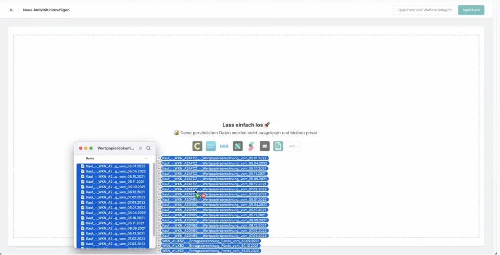 Der Import deiner Daten kann entweder manuell oder per Null-Klick-Import erfolgen. Das heißt, du lädst die PDF- oder CSV-Datei deiner Transaktionen beim jeweiligen Anbieter herunter und lädst sie dann per Drag & Drop in parqet hoch. Folgende Anbieter werden für den Null-Klick-Import unterstützt: