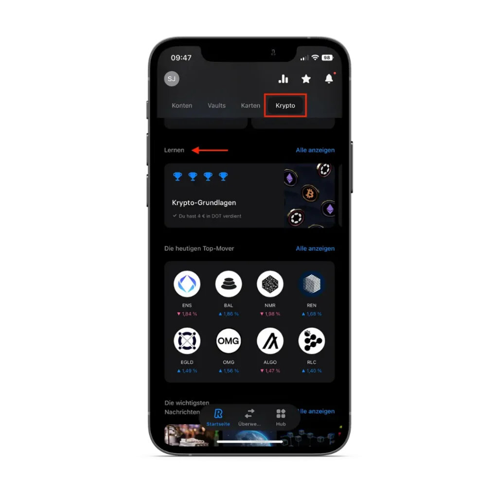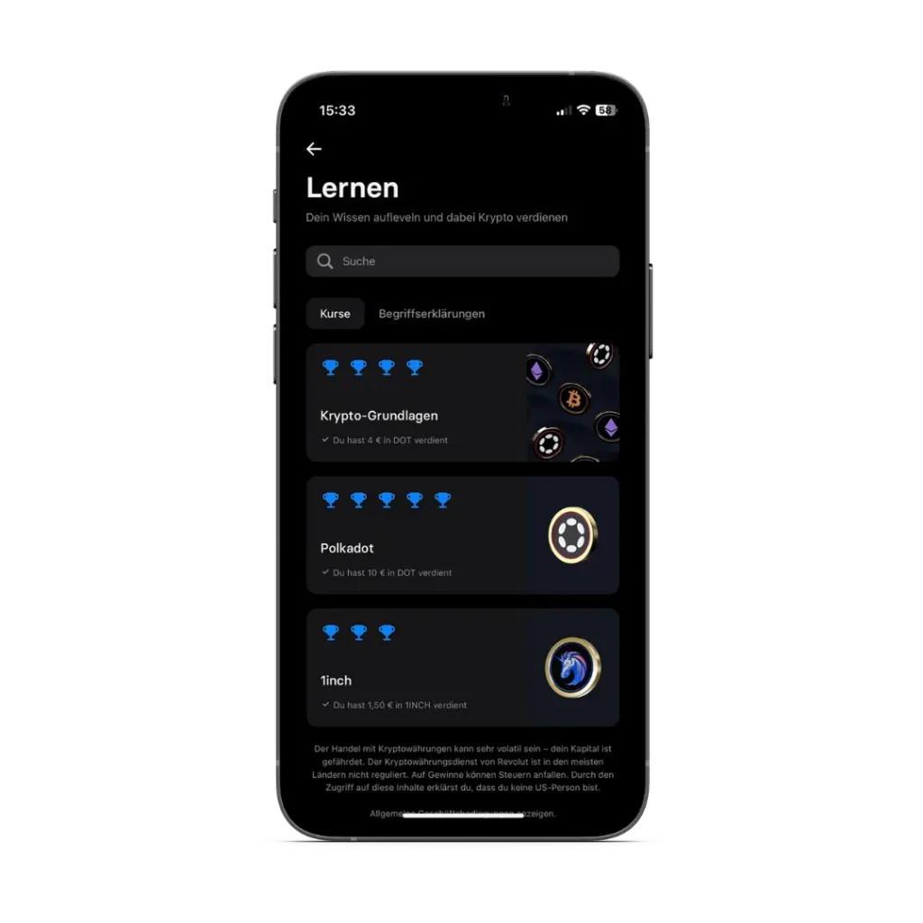 Schritt 1: Das Revolut Krypto-Quiz findest du in der Revolut App unter dem Reiter „Krypto“ in der Sektion „Lernen„.