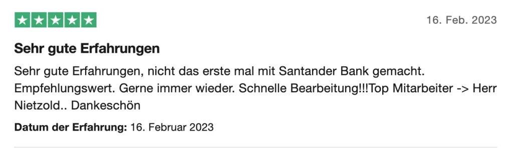 Es finden sich jedoch keine Erfahrungsberichte, die sich speziell auf die Ablösung eines Kredites beziehen. Dies lässt den Schluss zu, dass es sich bei der Santander Bank um ein sehr standardisiertes Verfahren handelt und keine Probleme bei der Kreditablösung zu erwarten sind.