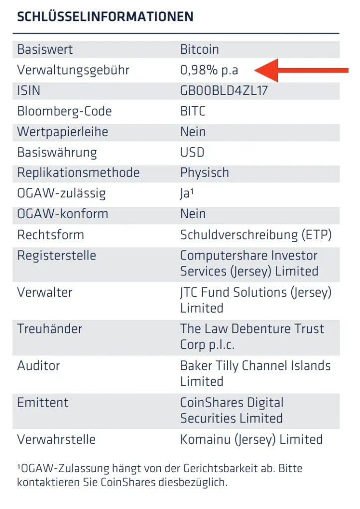 | Verwaltungsgebühr pro Jahr (Beispiel Bitcoin) | 0,98 % | Keine |