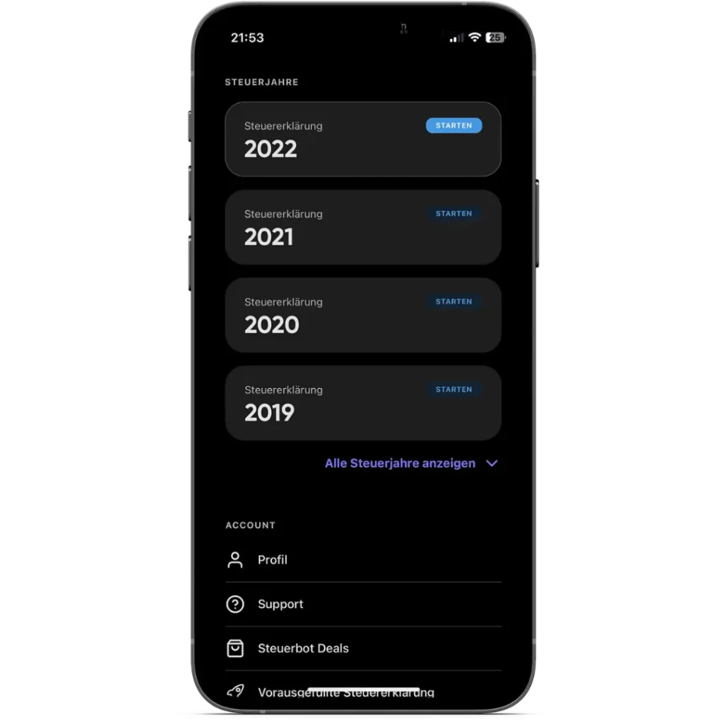 Schritt 4: Wähle das Steuerjahr aus, für das du deine Steuererklärung erstellen möchtest, und lass dir von Steuerbot bei deiner Steuererklärung helfen. Das Ganze dauert nicht länger als 20 Minuten und du kannst eine Menge Geld sparen. Der Steuerbot Rabattcode ist in deinem Profil hinterlegt.