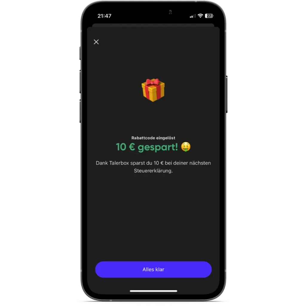Nutze unseren Talerbox-Link> um 10€ Rabatt bei Steuerbot zu erhalten. Alternativ kannst du den Code oben rechts unter dem Geschenksymbol „Profil“ > „Einladung einlösen“ eingeben.