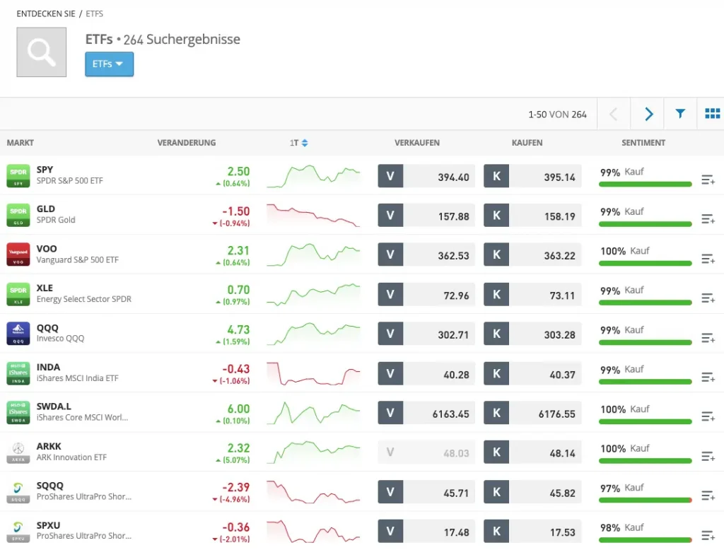 Auch bei eToro lassen sich über 1500 Aktien und über 250 ETF ohne Gebühren handeln. Jedoch bietet eToro keine Möglichkeit an, diese automatisiert per Sparplan zu kaufen.