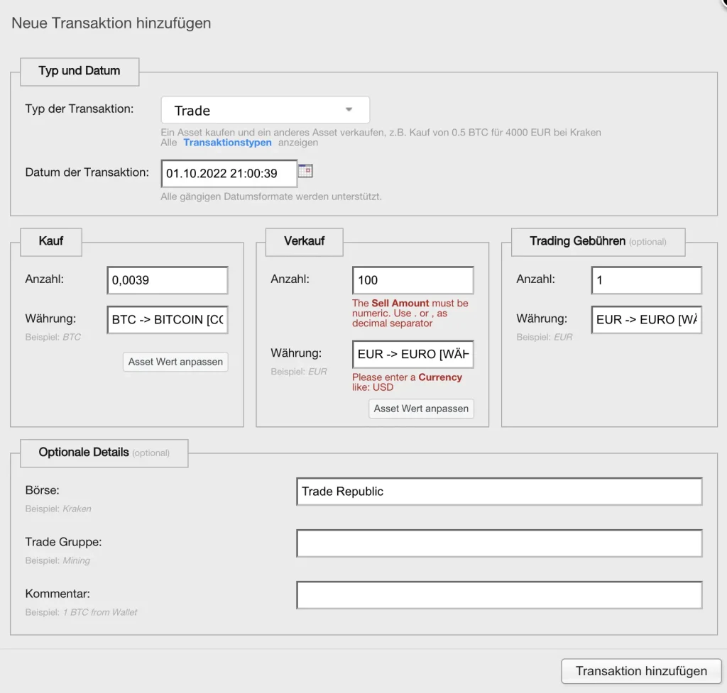 Beispiel: Ich habe hier einen Trade am 01.10.2022 um 21:00:39 Uhr eingetragen. Dabei habe ich für 100 € (Verkaufsfeld) 0,0039 Bitcoin (Kauffeld) gekauft. Als Börse wurde Trade Republic verwendet (Börsenfeld) und es sind 1 € an Handelsgebühren angefallen.