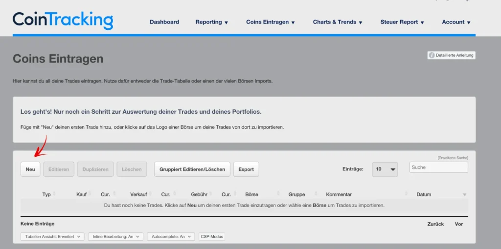 Schritt 2: Klicke nun auf “Neu”. Es öffnet sich ein Menü, in dem du eine Transaktion manuell eingeben kannst. Wenn du noch andere Krypto-Börsen wie zum Beispiel Bitvavo nutzt, empfehlen wir dir immer den API-Import bei Cointracking zu nutzen. Damit können alle Transaktionen innerhalb weniger Minuten automatisch importiert werden, ohne dass du diese manuell erfassen musst.