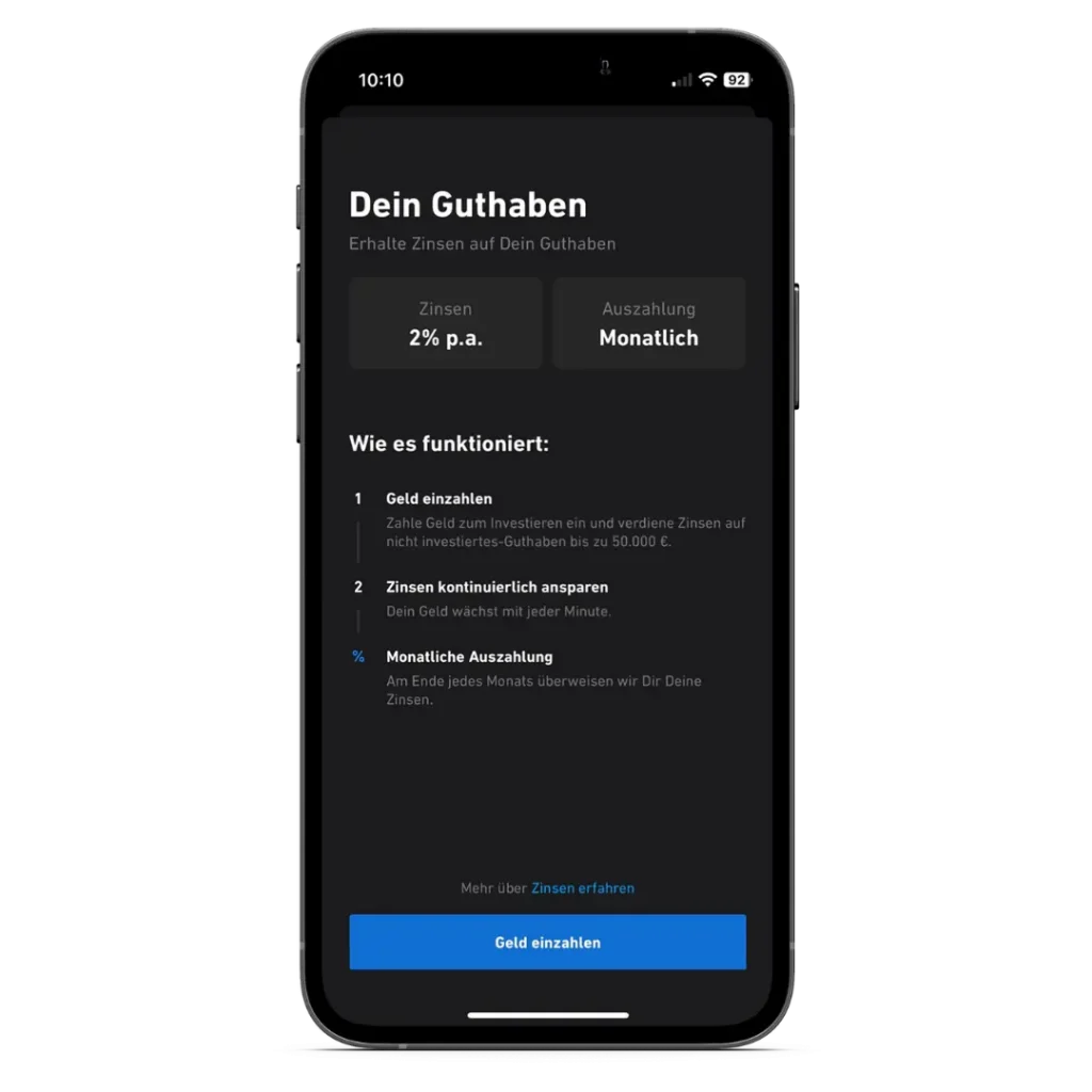 Zinsen auf dem Trade Republic Tagesgeld gibt es bereits ab dem ersten Euro. Eine Mindesteinlage gibt es nicht. So kann jeder, unabhängig vom verfügbaren Kapital, vom Tagesgeldkonto profitieren.