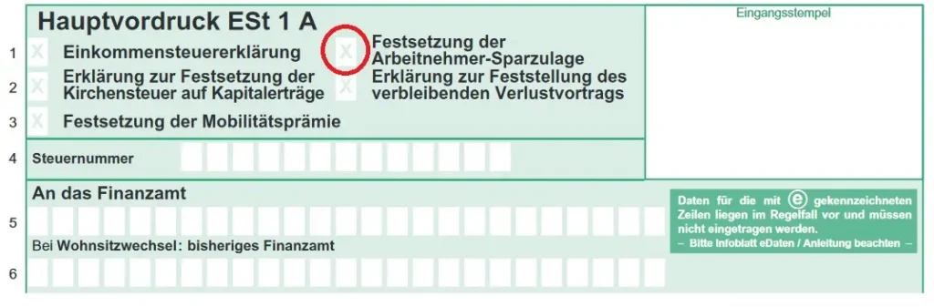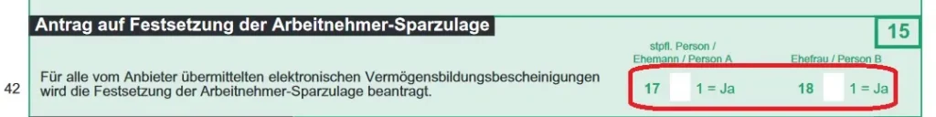 Die für den Antrag notwendigen Daten übermittelt dein Anbieter automatisch an das Finanzamt. Du selbst musst im Mantelbogen der Steuererklärung / Hauptvordruck ESt 1 A lediglich ein Kreuz bei “Festsetzung der Arbeitnehmer-Sparzulage” setzen und unter Punkt 42 angeben, ob dein/e Ehepartner/in ebenfalls zulagenberechtigt ist.