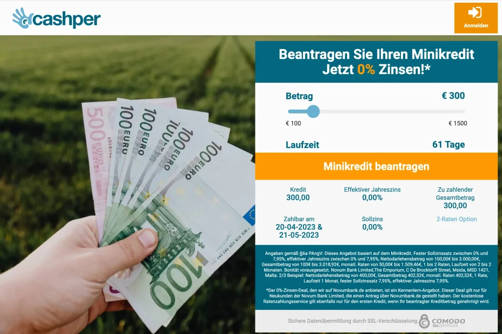 Cashper ist ein Angebot der Novum Bank Limited, die ihren Sitz in Malta hat und über eine Banklizenz verfügt. Mit Cashper kannst du auch Minikredite bis zu einer Darlehenssumme von 1500 € erhalten, vorausgesetzt du bist volljährig und hast einen dauerhaften Wohnsitz in Deutschland. Es wird außerdem ein Nachweis über ein monatliches Einkommen von 400 € benötigt, wobei es sich nicht zwangsläufig um einen Gehaltsnachweis handeln muss, sondern es muss lediglich ein monatlicher Cashflow in dieser Höhe vorhanden sein.
