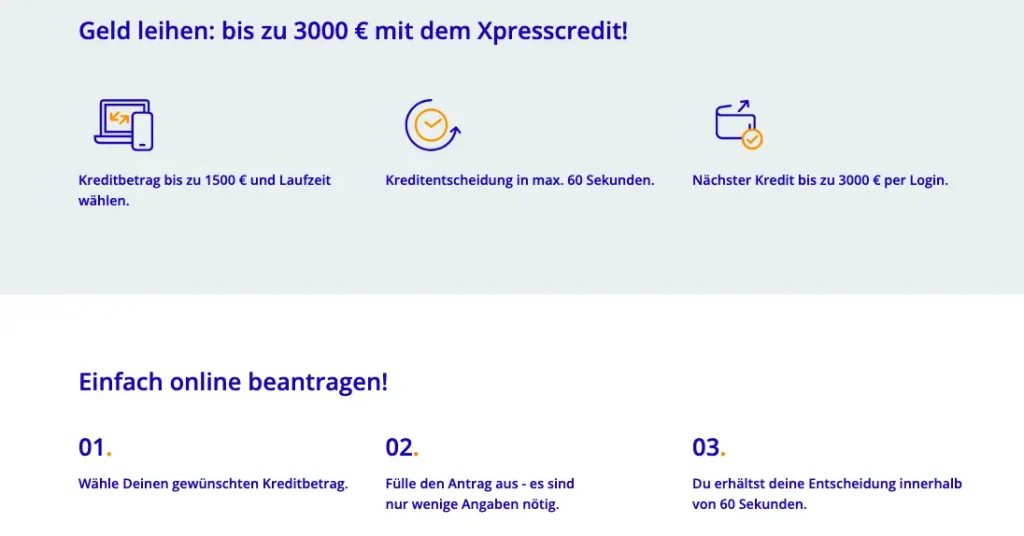 | Kreditsumme | Bis 3000 € (Neukunden 1500 €) |