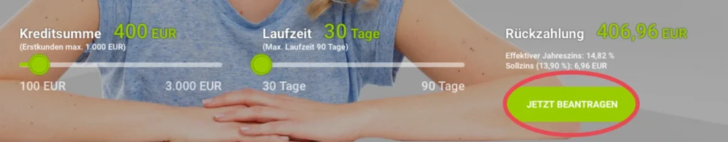 Für die maximale Laufzeit von bis zu 90 Tagen werden keine zusätzlichen Gebühren fällig. Unabhängig von der Laufzeit bleibt der Zinssatz immer gleich bei effektiv 14,82 % p.a. Nimmst du beispielsweise einen 60-Tages-Kredit über 500 € auf, beläuft sich der Kredit insgesamt auf 508,70 € in 2 Raten á 254,35 € (Zinsen + Tilgung).