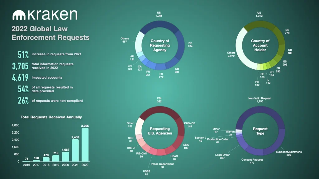 Die Krypto-Börse Kraken macht dies in ihrem jährlichen Bericht “Global Law Enforcement Requests” transparent und zeigt auf, welches Ausmaß die Datenanfragen bereits angenommen haben, um Einblick in die persönlichen Daten der Krypto-Nutzer zu erhalten.
