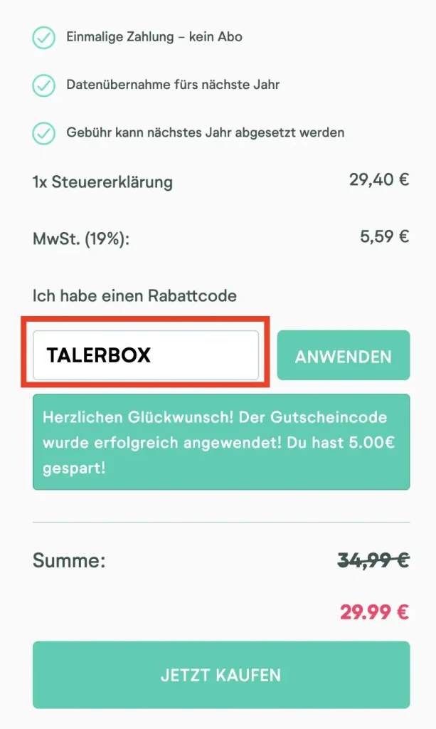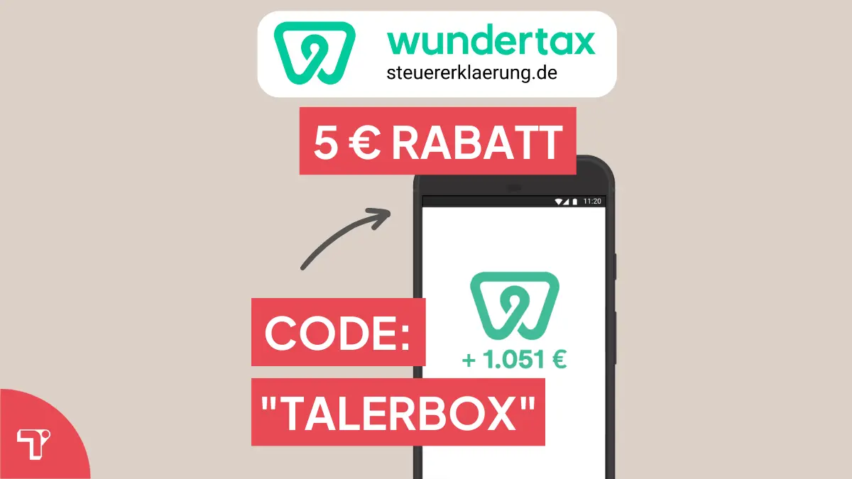 Gib einfach nach dem Erstellen der Steuererklärung beim Bezahlvorgang den Wundertax Gutscheincode „TALERBOX“ ein und spare 5€ mit dem Rabattcode. Wundertax kann bis zur Abgabe der Steuererklärung kostenlos und ohne Risiko getestet werden.